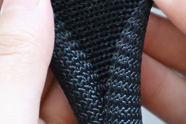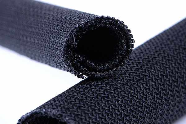 KST2565型ラップスリーブは、強靭なPETモノフィラメントと柔軟なマルチフィラメントを緻密に編み込んだ自己巻き付け型保護スリーブです。独自のツイスト形状(セルフクロージング構造)により、ケーブルを包み込むように自動で閉じ、マジックテープや結束バンドを使わずに配線を保持できます。ニット構造のクッション性により、外部からの衝撃や摩擦を緩和するとともに、振動による異音を大幅に低減します。
